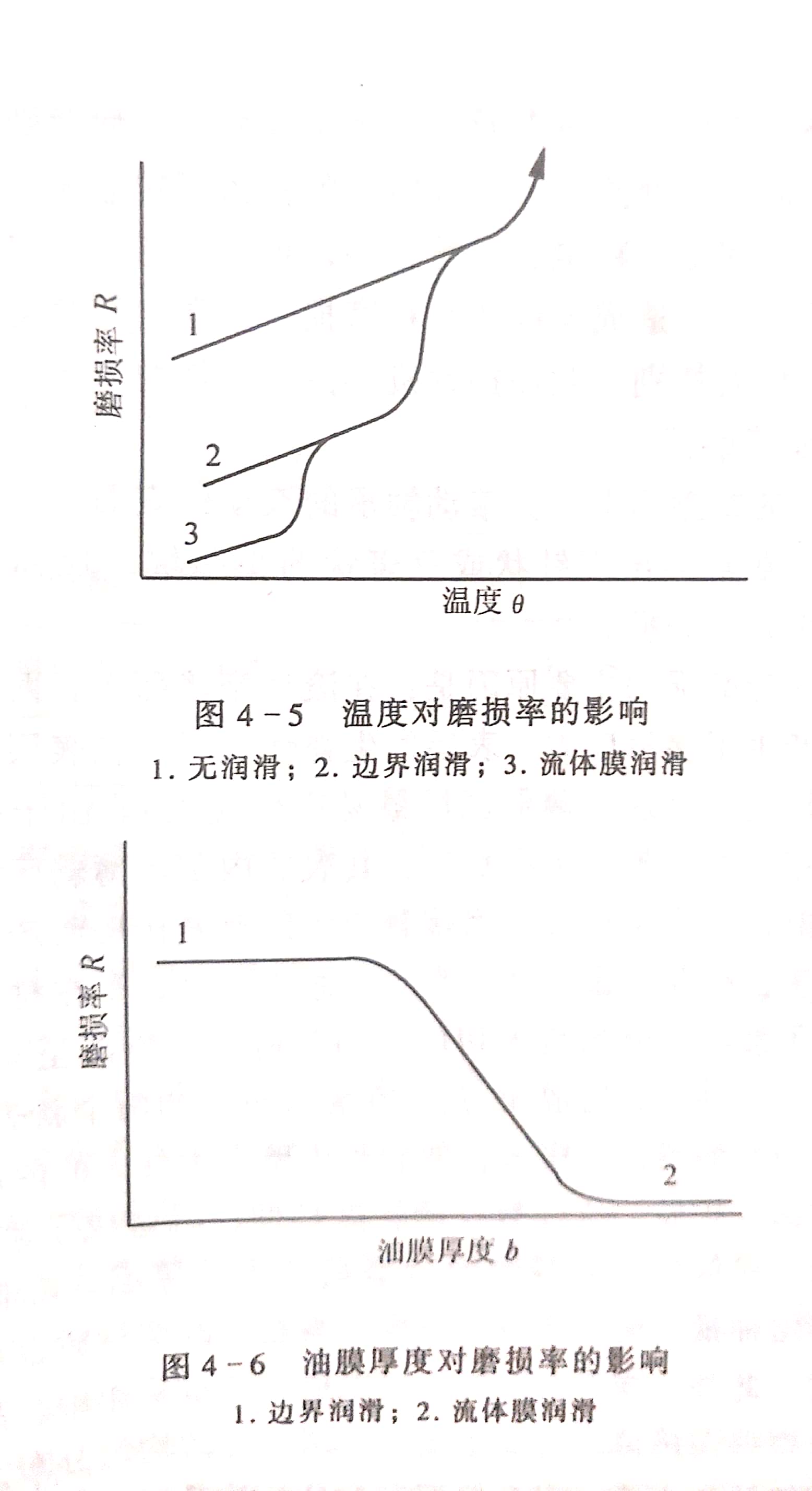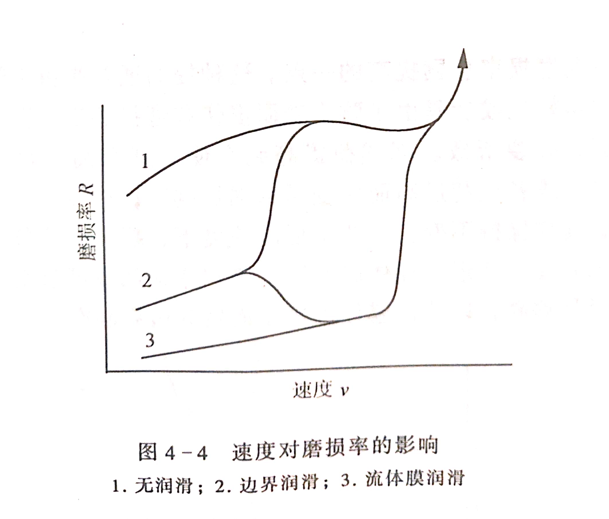 如圖4-4所示。提高無潤滑接觸處的速度,通常會使磨損率提高到使材料發(fā)生明顯的熱軟化(與載荷的作用相同)。然而,在較高的速度下,磨損率可能降低,因為產(chǎn)生一個完整磨粒的時間較少。邊界潤滑的磨損率常常隨速度的提高而提高,直到潤滑劑因溫升而失效為止。如果潤滑劑含有合適的添加劑,就不會出現(xiàn)失效速度,反而磨損率將隨著流體膜厚度增大到完全流體膜的厚度而降低。流體膜的磨損率非常低(接近于零),除非達(dá)到的溫度使?jié)櫥瑒┎辉侔褍杀砻嫱耆糸_(因溫升而失效)或較高的速度下循環(huán)次數(shù)增多使磨損類型轉(zhuǎn)為疲勞磨損。