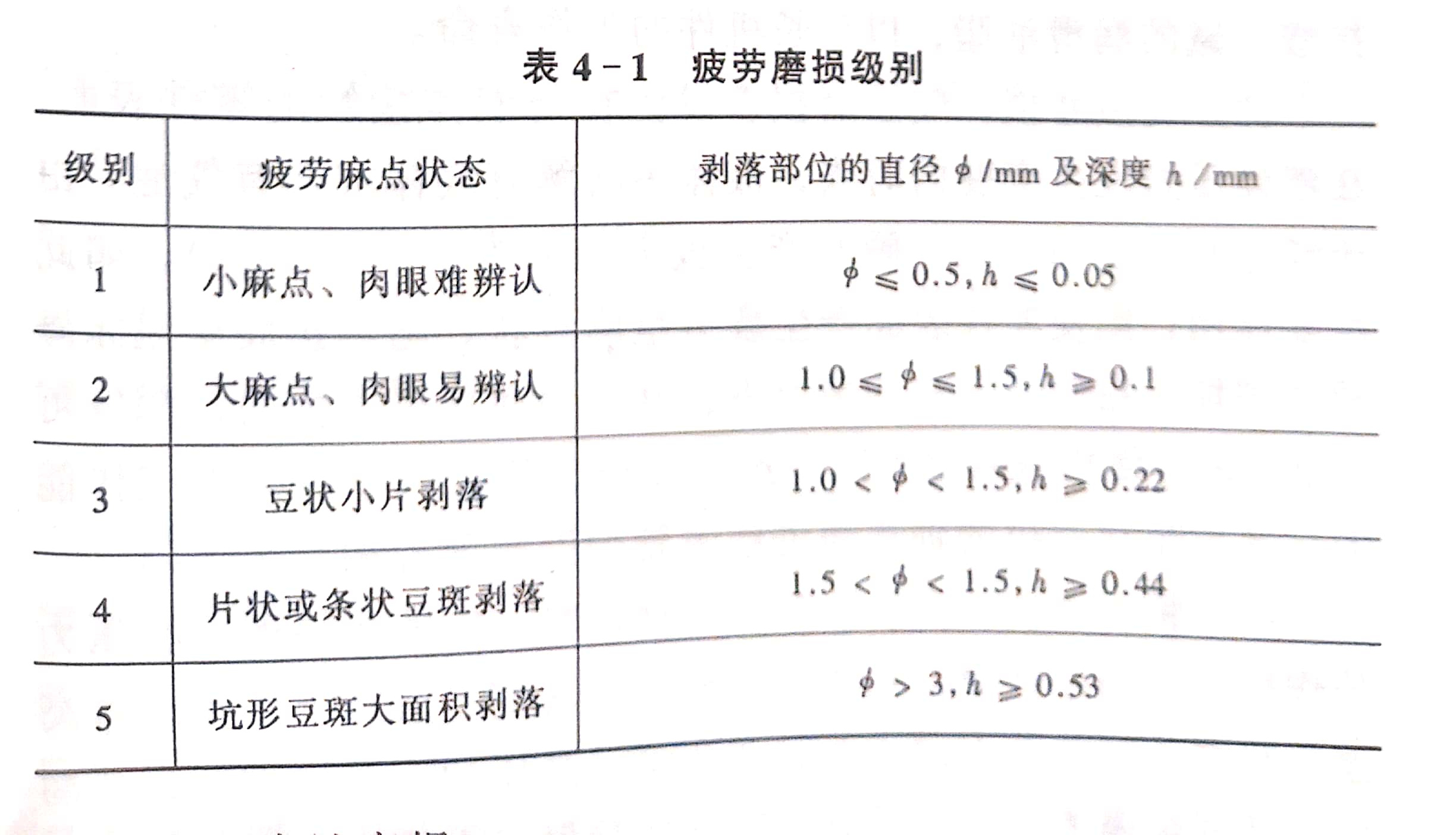疲勞磨損的程度,可以分為5個(gè)級別,見表4-1。