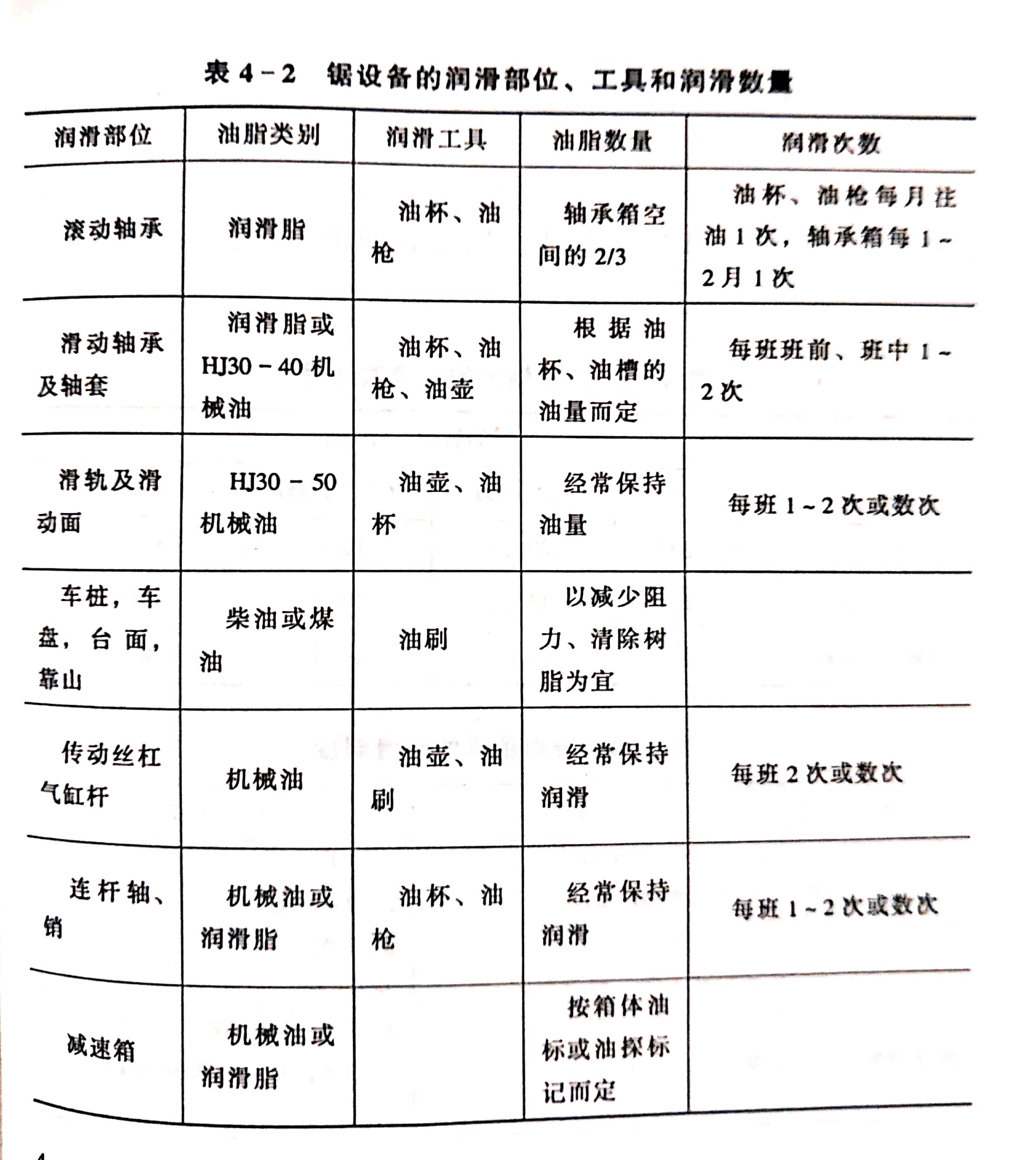 根據(jù)帶鋸機(jī)設(shè)備的軸承、滑動表面的運(yùn)行速度、負(fù)荷、溫度和季節(jié)等選擇適宜的潤滑油脂。如:帶鋸機(jī)鋸輪軸承的負(fù)荷大,有水浸入的可能,溫度又低,應(yīng)選用鈣基脂、針入度小的潤滑脂;跑車牽引裝置的卷繩輪軸承的負(fù)荷較大,轉(zhuǎn)速低,經(jīng)常變換轉(zhuǎn)速及方向,應(yīng)選用粘度大的機(jī)油,但冬季要選用粘度小而凝固點(diǎn)低的機(jī)油,夏季則相反。帶鋸機(jī)設(shè)備的潤滑部位、工具和潤滑數(shù)量列入表4-2。