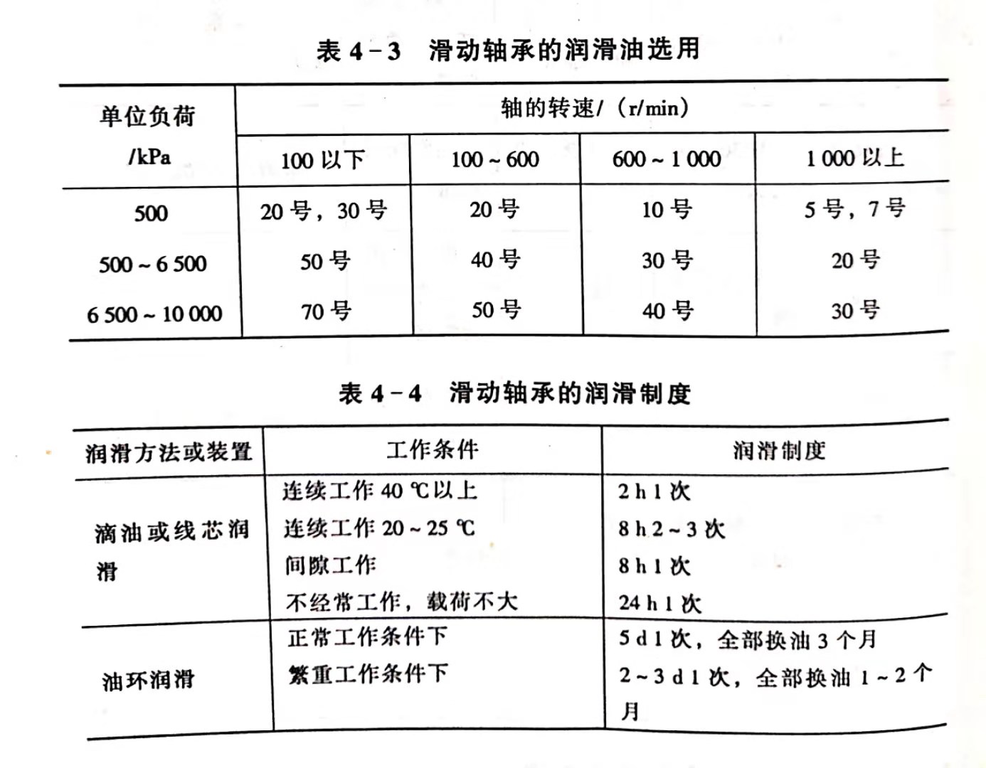 ④負荷愈大潤滑油的粘度也應愈大。負荷愈小潤滑油的粘度也應愈小?;瑒虞S承的潤滑油選用及其潤滑制度見表4-3、表4-4.
