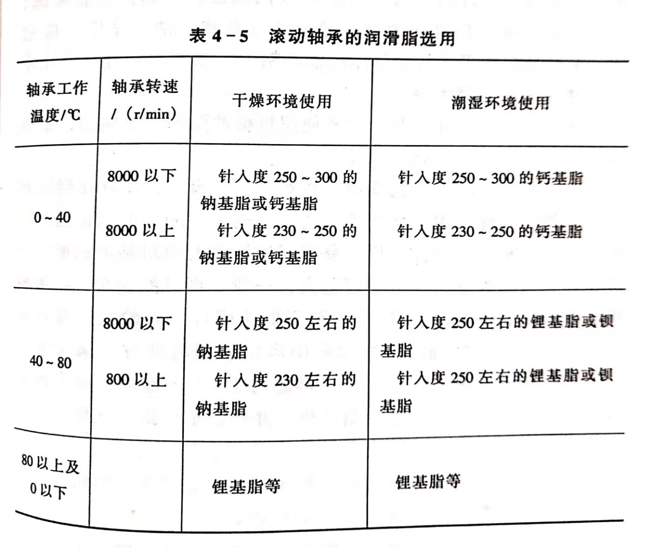 ②鋸機大多數滾動軸承都采用潤滑脂潤滑,選用時應考慮轉速、負荷、工作溫度及工作環(huán)境等。工作溫度不高于70℃,在潮濕環(huán)境中工作的軸承可選用耐水性較好的鈣基脂;一般溫度(30~90℃)下工作的滾動軸承。低速采用鈉基或鈣鈉基脂;中速采用鈣基脂,但工作溫度不得超過70℃;高速采用鋰基脂或主軸脂;在極低溫(-50~70℃)下工作的滾動軸承采用特殊雙脂。各種滾動軸承潤滑脂的選用可參考表4-5。